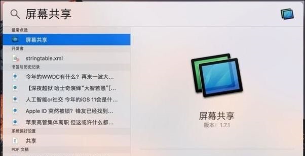 1.通過Command+空格鍵打開Spotlight搜索,然后輸入“屏幕共享”,雙擊打開屏幕共享。
