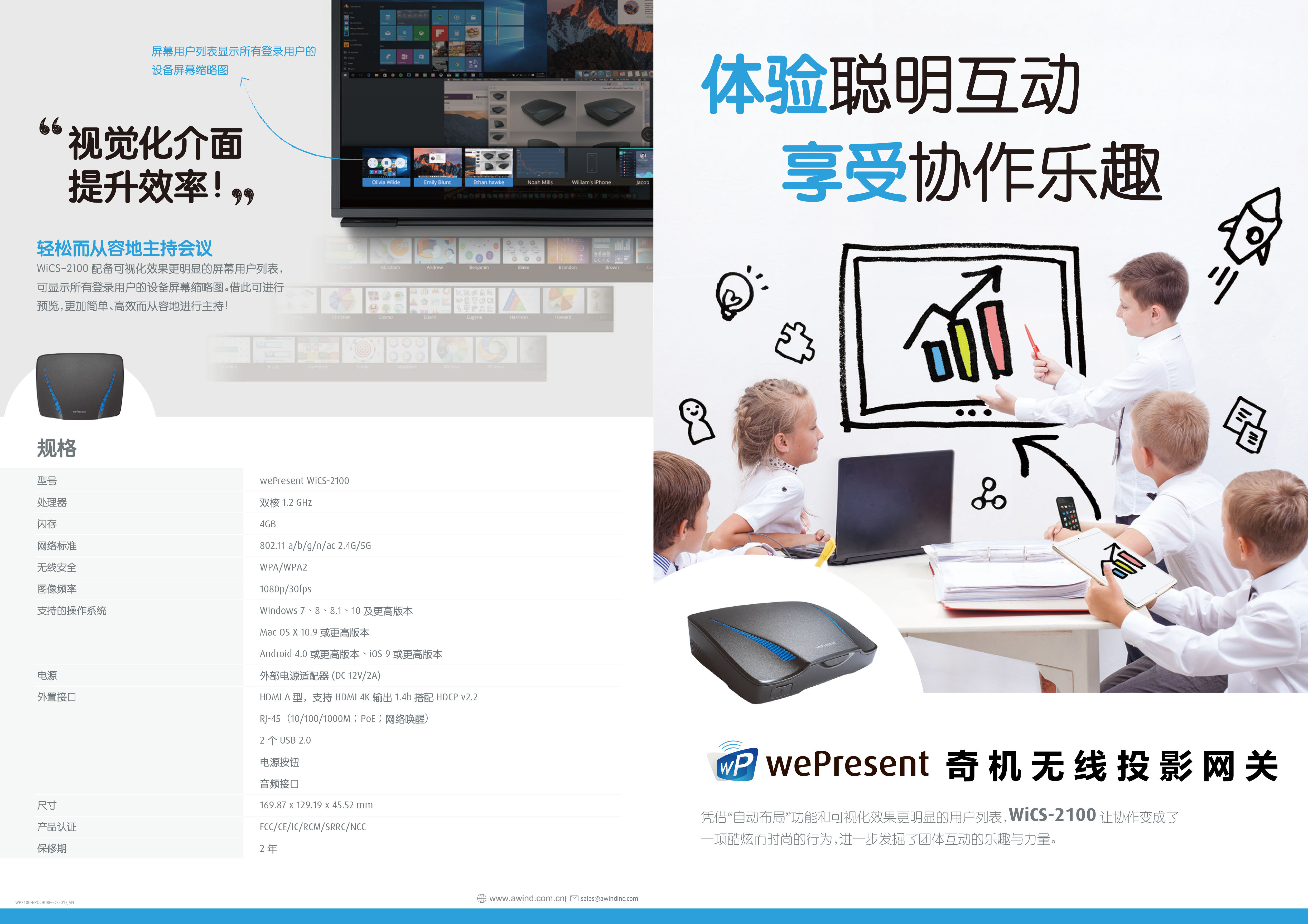 wePresent的WiCS-2100是一款簡單易用的無線演示協作解決方案,可讓用戶與任何類型的設備進行演示、多屏互動和協作。WiCS-2100是第一款提供節能待機模式的wePresent設備,可降低功耗,同時不會影響性能或可靠性。節能待機模式利用可靠的電源來維持功能,同時節約能源使用。
