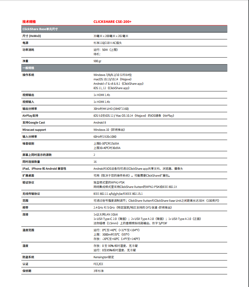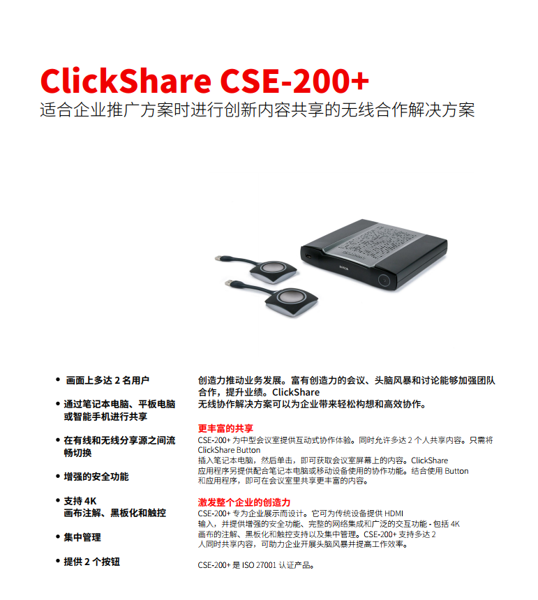 CSE-200+專為企業展示而設計。它可為傳統設備提供HDMI輸入,并提供增強的安全功能、完整的網絡集成和廣泛的交互功能-包括4K畫布的注解、黑板化和觸控支持以及集中管理。CSE-200+支持多達2人同時共享內容,可助力企業開展頭腦風暴并提高工作效率。