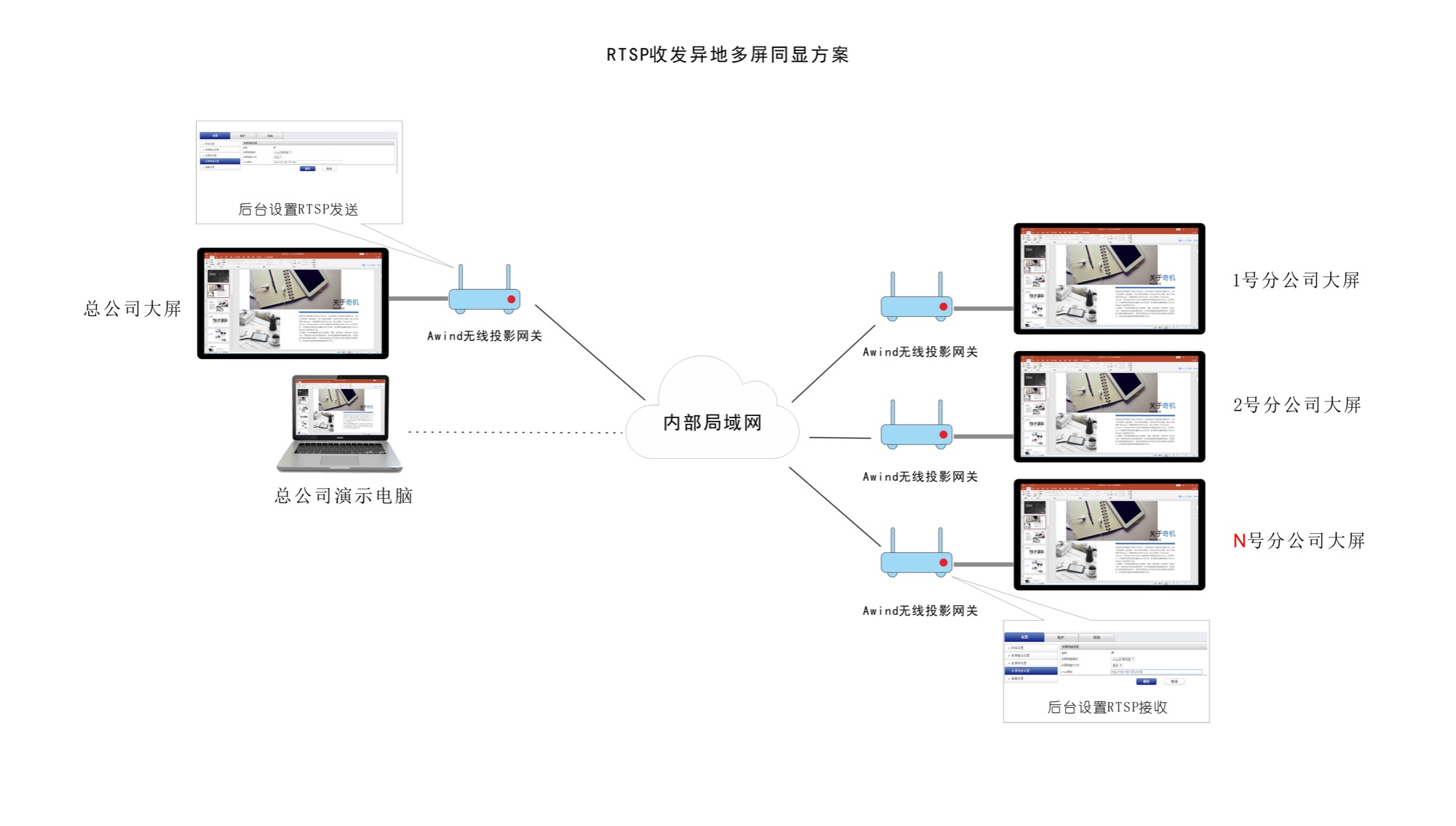 RTSP收發異地多屏同顯方案功能實現:該方案可實現總部大屏內容與各異地分部大屏同步顯示,分布點數量可達16個。 前提:各分公司的AWIND無線投影網與總公司的AWIND無線投影網處在同一內部局域網 搭建步驟:1. 將總部的AWIND無線投影網關通過HDMI接入總公司的大屏;2. 將總部的AWIND無線投影網關接入內部局域網;3. 登錄總部AWIND無線投影網關的后臺設置RT
