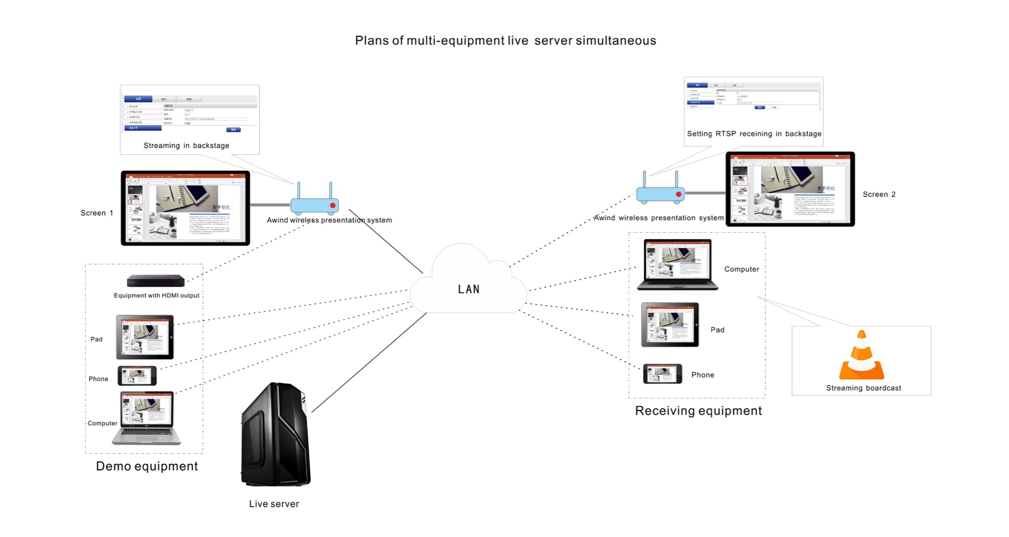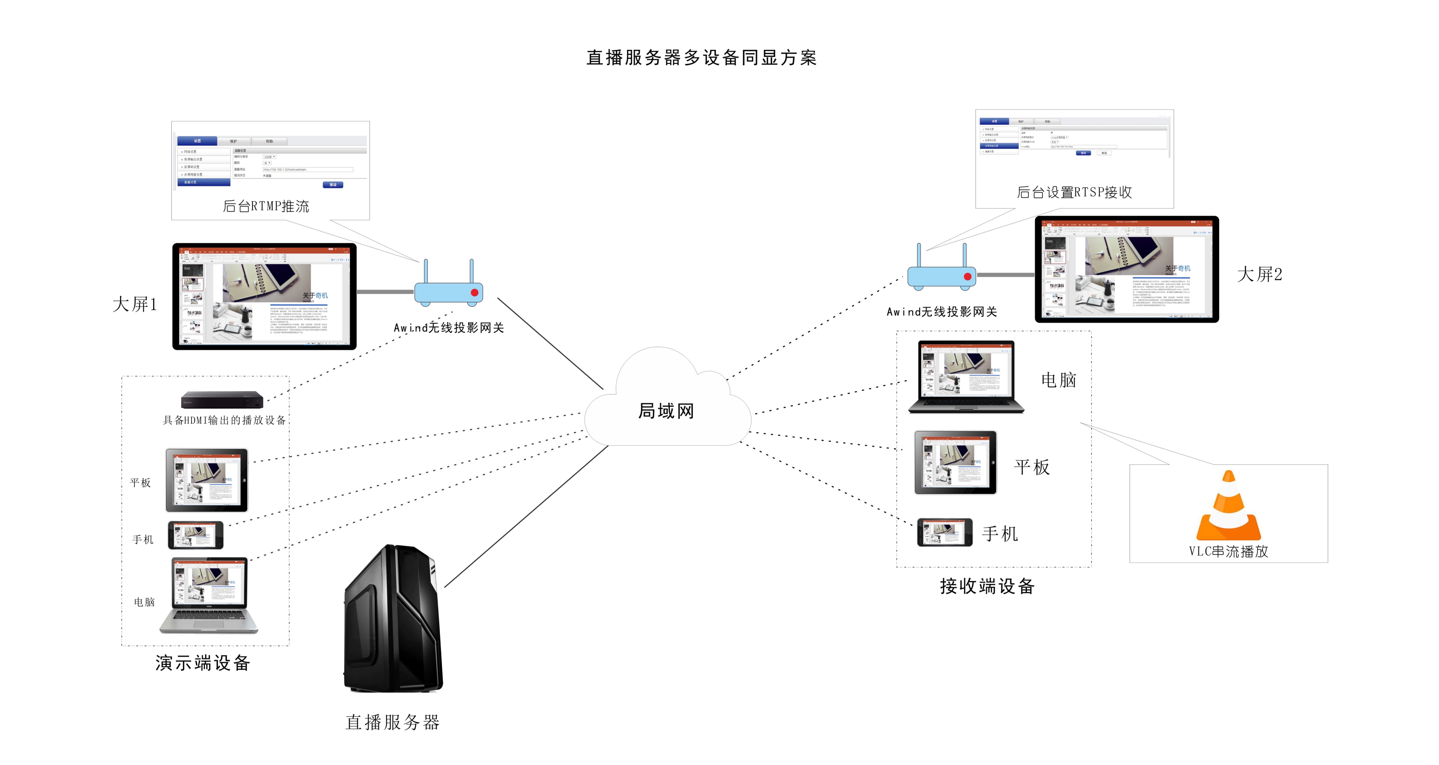 直播服務器多設備同顯方案功能實現:該方案可實現演示大屏內容與局域網內各大屏和智能端設備(電腦,手機,平板)同顯,數量可達100。 前提:所有設備處在同一局域網。 搭建步驟:;1. 打開直播服務器生成RTMP推流地址和RTSP接收地址;2. 將其中的一臺AWIND無線投影網關通過HDMI接入大屏1,登錄這臺AWIND無線投影網關的后臺設置RTMP推流地址并點擊推流;3. 將所